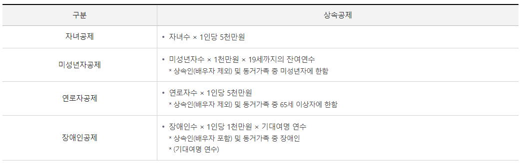 인적공제는 상속인의 가족 구성원 수에 따라 적용되는 공제입니다. 자녀공제, 미성년자공제, 연로자공제, 장애인공제 등이 포함되며, 각각의 공제 항목에 따라 공제액이 다릅니다. 예를 들어, 자녀 한 명당 5천만원, 미성년자 한 명당 1천만원 등이 공제됩니다. - 동거주택 상속공제